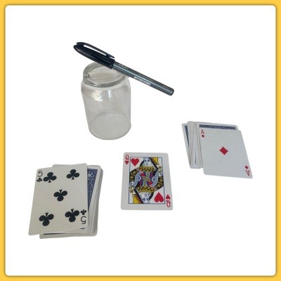 Uma carta escolhida é perdida no baralho. Uma caneta é equilibrada no copo e as cartas são passadas uma a uma, sobre a mesa. A caneta cai do copo exatamente na carta escolhida!